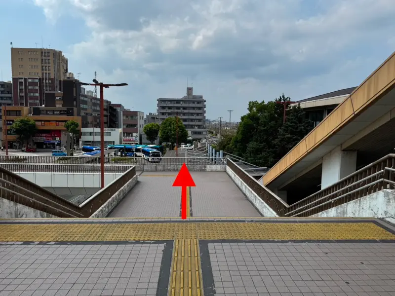 踊り場右側の階段を降りて歩道橋に入り、左に曲がります。そのまま突き当たりまで真っ直ぐ進みます
